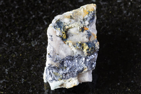 sample of rough molybdenite and chalcopyrite in colorless beryl rock on black granite background close up from Altai, Russia