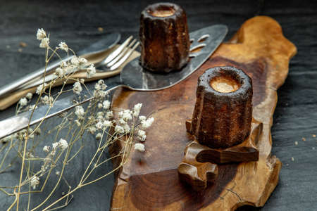 Cannelés (Canelés) de Bordeaux Recipe is a small pastry with rum and vanilla on a wooden plate. Traditional French sweet dessert. tasty snacks. Top view. Place for text.