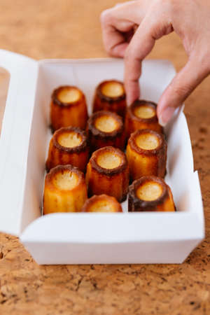 Female hand picking fresh baked Canelés inside white paper box. A small French pastry flavored with rum and vanilla with a soft and tender custard center and a dark, thick caramelized crust.