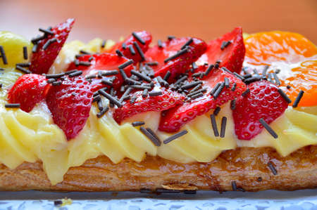 closeup of puff pastry with custard cream and many fruits as strawberries oranges and kiwis and chocolate chips over the fruit