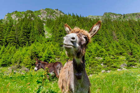 Funny donkey portrait with mountain landscape in background