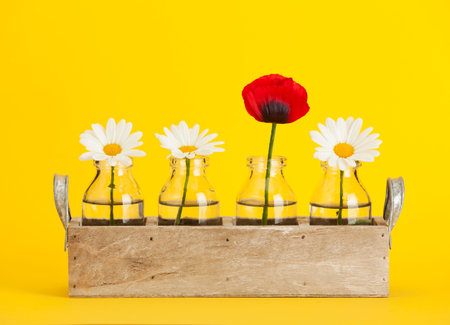 Wooden tray with small bottles containing three marguerite daisy and one red poppy flowers, yellow background