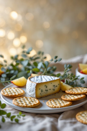 Delicious cheese platter featuring creamy cheese and crackers with fresh fruits and greenery in soft lighting