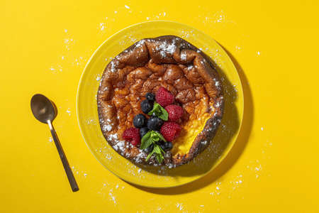 Homemade cheesecake with blueberries, currants, strawberries and mint leaves from above. Flat lay