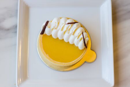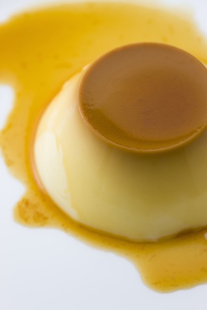 Pudding Caramel Custard in white plate on wooden background.