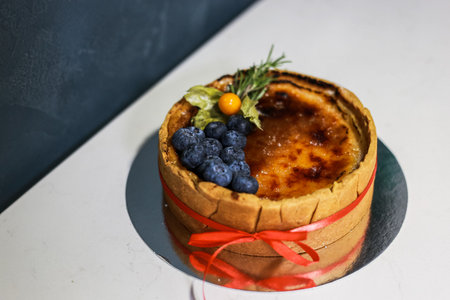 typical portugese egg tart pastel de nata on gray ceramic background