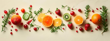 An overhead view of various fruits and herbs including oranges, strawberries, and rosemary, artfully arranged on a neutral background. The image has a fresh, natural feel, suitable for health, cooking, or nutrition themes.