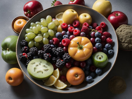 This beautiful arrangement features a variety of fresh fruits and greens, showcasing vibrant colors and textures that emphasize healthy eating and nutrition.