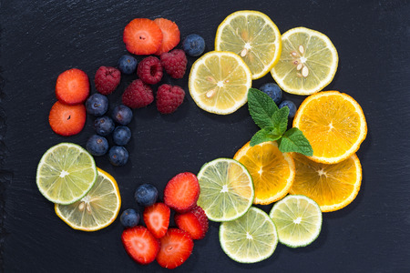 assortment of citrus and fresh berries on a dark background, top view, horizontal