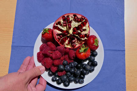 Closeup of a hand serving or holding a plate or bowl with blueberries, raspberries, strawberries and a half pomegranate
