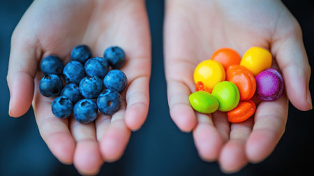 Close up of child's hands holding blueberries and colorful candies