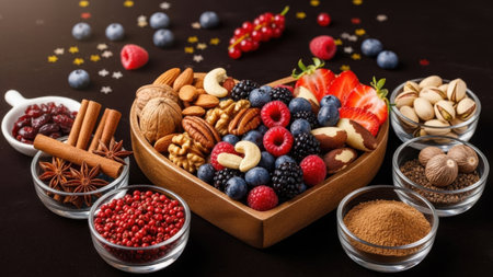 AI Generated. Healthy Snack Ingredients Flat Lay with Berries and Nuts