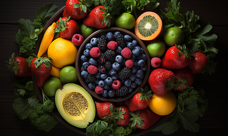 Round bowl with various berries, nuts, greens, fruits and vegetables, on wooden table, Perfect for food and drink projects. Wellbeing and healthy eating. Generative AI