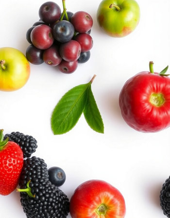 A colorful assortment of fresh berries and fruits, including strawberries, blackberries, and tomatoes, displayed in natural sunlight, showing natures vibrant bounty.