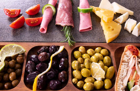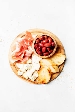 Italian prosciutto crudo or jamon with olives and cheese
