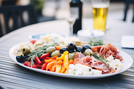 Tapas plate with sausage, ham, olives, tomatoes and cheese