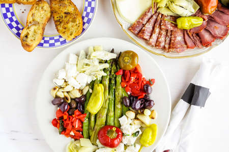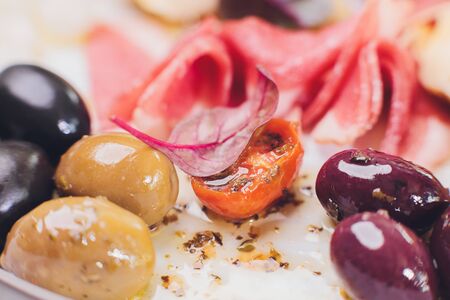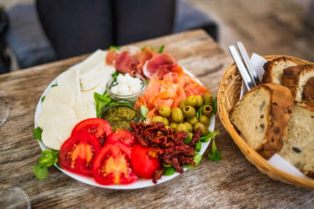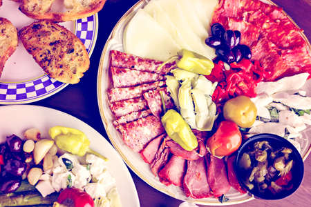 Appetizers plate with vegetarian antipasto in Italian restaurant.