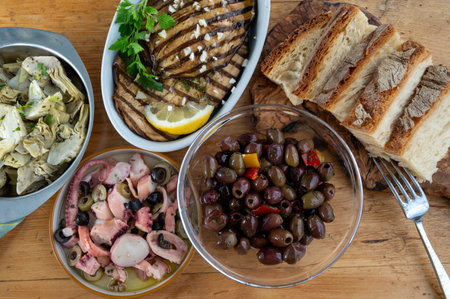 Pickled olives, grilled eggplant, octopus seafood salad, artichokes, vegetables on wooden table, variety of tasty Italian starters, antipasti, top view