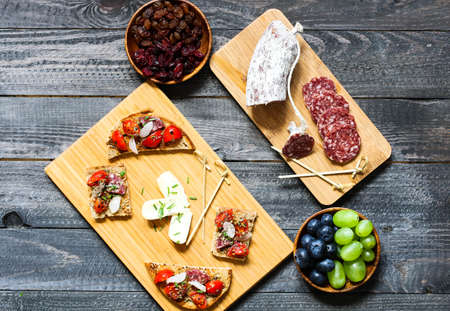 Italian antipasti wine snacks set. Bruschetta, olives, mozzarella cheese, salami, tomatoes, olives, herbs on wooden board, top view