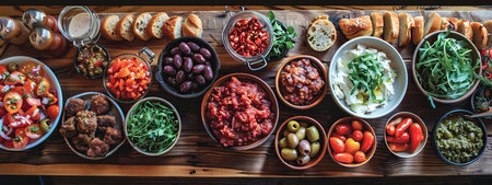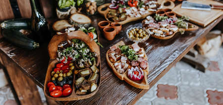 Dining table with a spread of appetizers, top view, empty space for copy