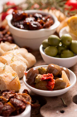 Meat appetizer selection. Salami, prosciutto, bread sticks, baguette, olives and sun-dried tomatoes, selective focus.