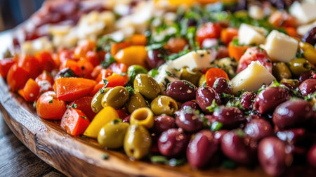 A vibrant close-up of a wooden plate overflowing with fresh ingredients, including olives, tomatoes, and cheese, perfect for gatherings or appetizers.