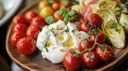 A vibrant wooden plate filled with fresh tomatoes, artichokes, and aromatic herbs. Perfect for showcasing organic ingredients in a culinary setting.