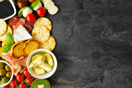 Italian theme charcuterie side border against a dark slate background. Variety of cheese, meat and fruit appetizers. Overhead view with copy space.