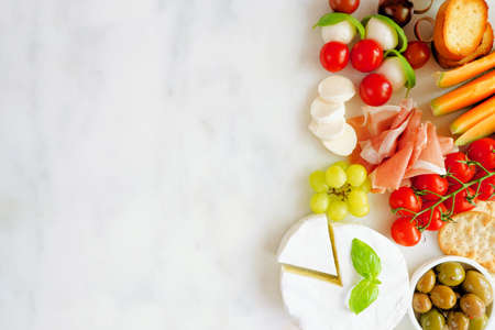 Italian theme charcuterie side border against a white marble background. Selection of cheese, meat and fruit appetizers. Overhead view with copy space.