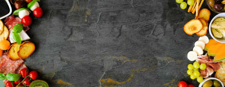 Italian theme charcuterie double border against a dark slate banner background. Mixed cheese, meat and fruit appetizers. Above view with copy space.