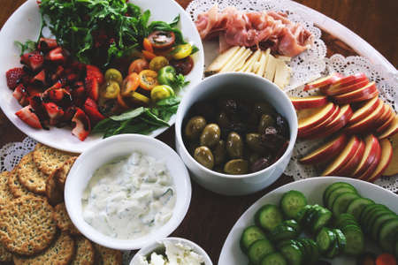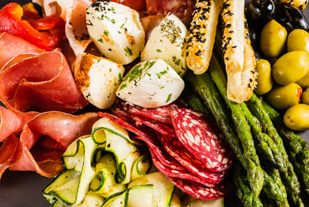 Close up of Mediterranean mixed platter to share with a selection of meats and cheeses