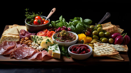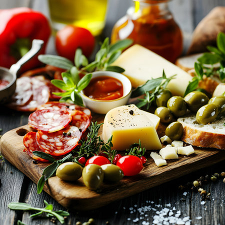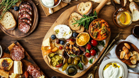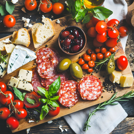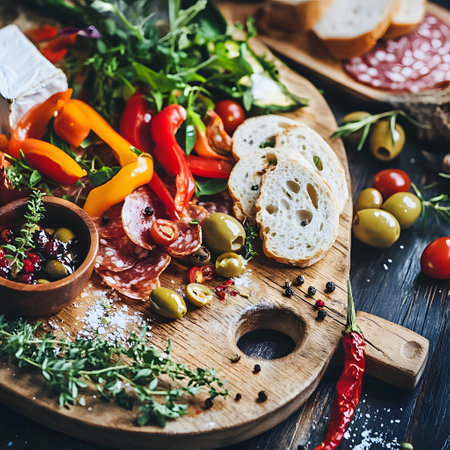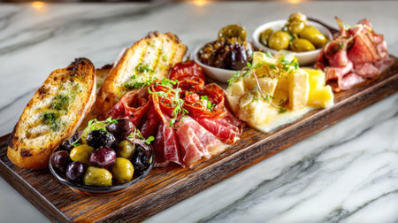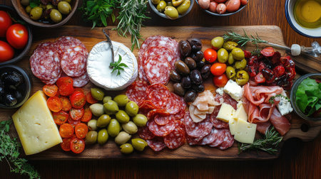 A delightful spread featuring an assortment of antipasti, including cured meats, cheeses, olives, and roasted vegetables, beautifully arranged on a rustic wooden board.