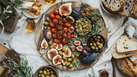 Top view of olives, figs, tomatoes and bread on wooden board