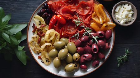 Traditional italian antipasti platter with olives, tomatoes, cheese and herbs on dark wooden background, top view