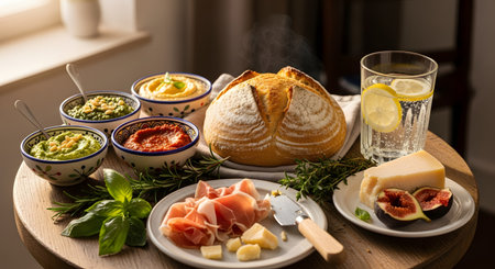 A delicious and rustic Mediterranean-style appetizer spread is beautifully arranged on a wooden table in a sunlit room. The feast includes a steaming loaf of artisan sourdough bread, bowls of pesto and other dips, sliced prosciutto, parmesan cheese, and fresh figs. This inviting scene represents sharing, hospitality, and wholesome, flavorful food.