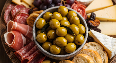 A close-up view of a small grey bowl filled with green olives, serving as the centerpiece of a charcuterie board. The board is also laden with cured meats, various cheeses, bread slices, and figs.