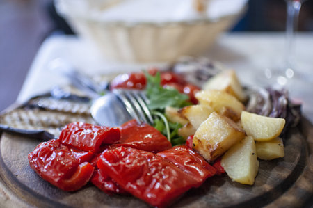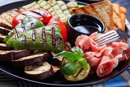 close-up of grilled vegetables, grilled sweet pepper, zucchini slices, eggplants, toasts served on a black plate with thinly sliced ham and vinegar sauce, horizontal view
