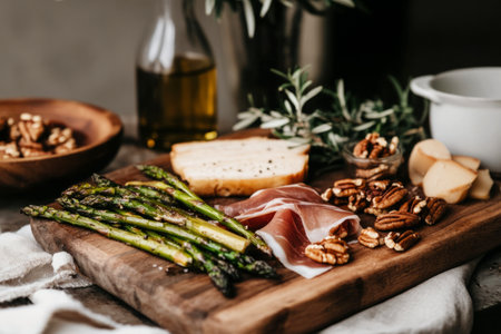 A beautifully arranged breakfast board showcases fresh asparagus, slices of cured meats, crunchy nuts, and creamy cheese on a wooden platter in a warm kitchen atmosphere.