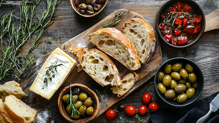 Features bread slices, cheese, bowls of olives, and fresh tomatoes on a rustic wooden surface, enhanced with herbs and scattered flour for a wholesome scene.