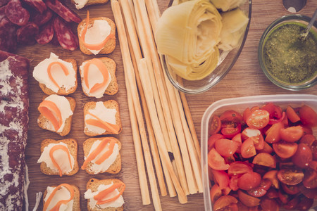 wood table with various food in a vintage tones and retro look. tomatoes, grissini, salmon, salami and green sauce