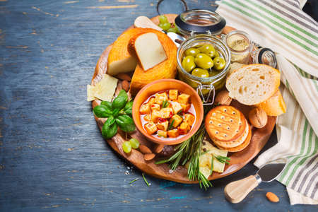 Light Italian snacks. A buffet table at a dinner party. Cheese plate. Delicious cheese mix on wooden table. Tasting dish on a wooden plate. Food for wine.