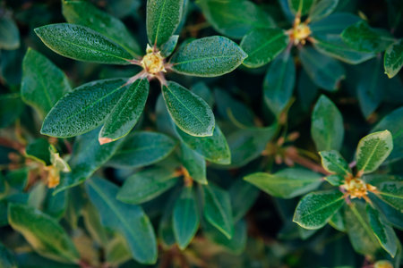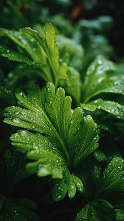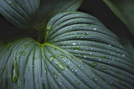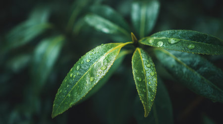 A striking close-up of fresh green leaves adorned with sparkling raindrops, creating a serene and tranquil atmosphere, perfect for nature-related themes.
