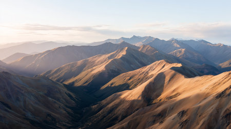 Mountains stretch over the horizon under the morning sky with warm light on the slopes