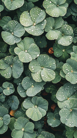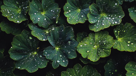 Dewy pennywort leaves glisten with fresh rain, showcasing nature's detail. Captured from above, the verdant foliage with delicate water droplets creates a soothing botanical scene.