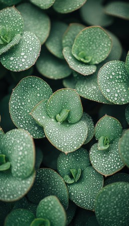 A close-up image of a succulent plant's leaves covered in morning dew, showcasing the intricate texture and pattern of the leaves.