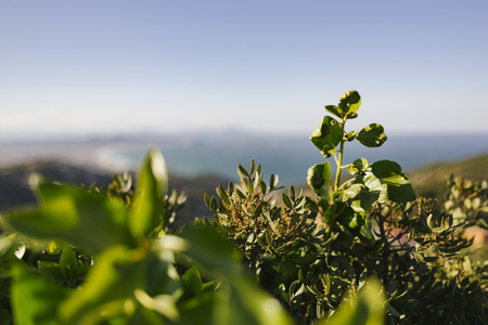Detail of blooming purple lavender on blurred seascape, Altea, Spain