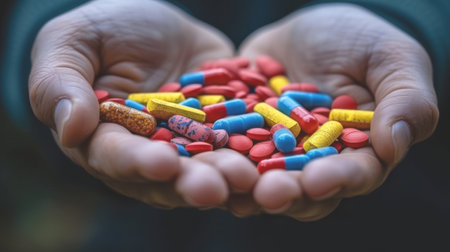 Closeup of a man holding colorful pills in his right hand