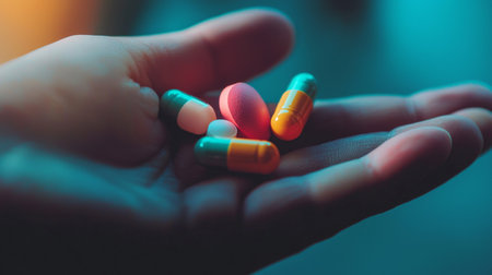 A close-up of a hand holding various colorful capsules and pills, representing healthcare, medication, and medical treatment in a modern setting.