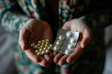 Woman's hand holding blister packs, nature bokeh background