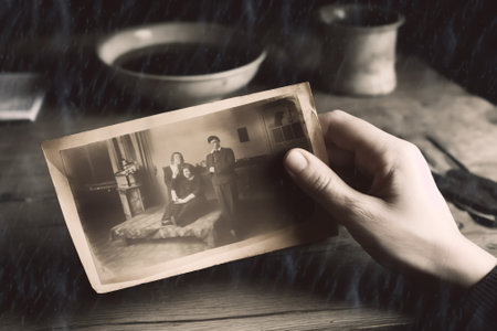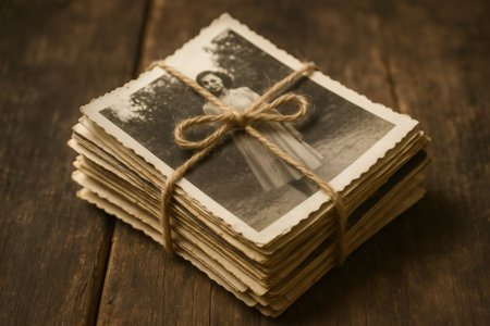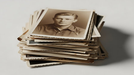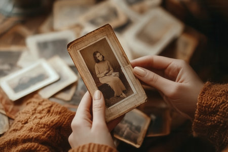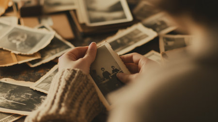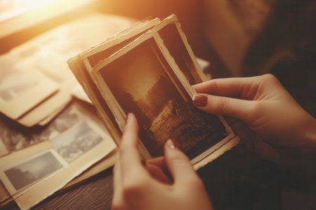 Warm tones highlight hands holding old photos, sparking nostalgia and a deep connection to cherished memories.